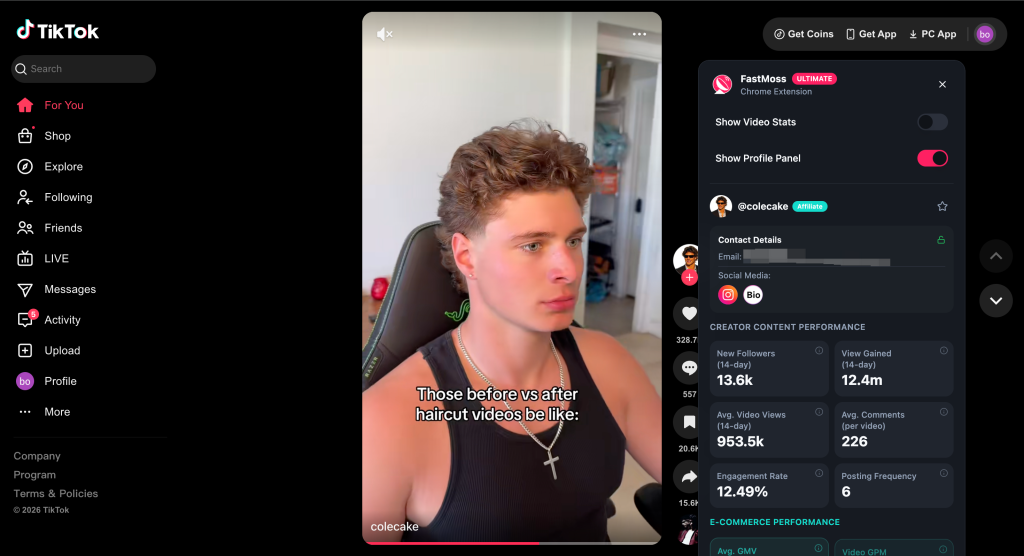 No more digging through link-in-bios or scrolling through endless comments. The extension provides an immediate overview of the author, including their following, total followers, total likes, and total videos. Crucially, FastMoss pulls available contact details directly into the panel, including Direct Email Addresses and linked social media accounts like Instagram. This feature alone will save influencer marketing managers countless hours, allowing for streamlined outreach directly from the source.