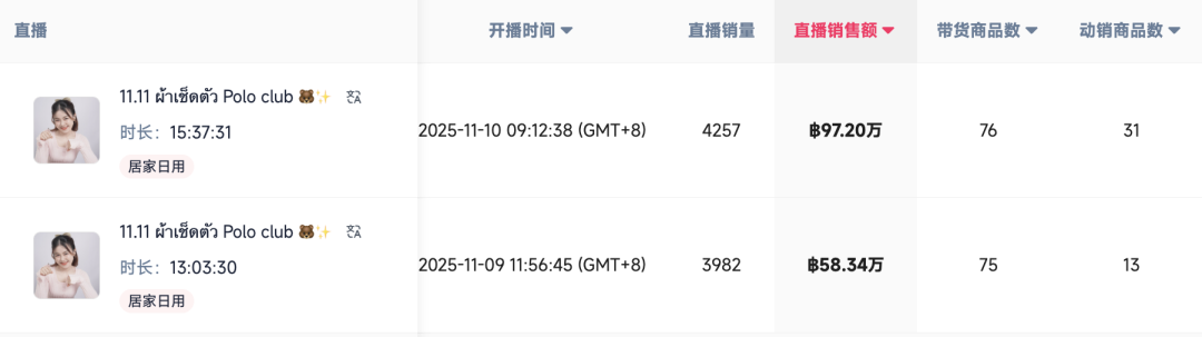 Cutie的实战智慧,在大型促销节点上体现得淋漓尽致。以刚刚过去的“双十一”为例,11月10日,她创下单场97.20万泰铢的销售额,前一日也达到58.34万泰铢,展现出强大的爆发力。