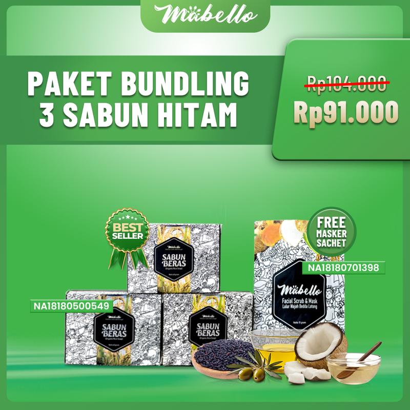 Mabello Paket Bundling 3 Sabun Beras Free Masker Sabun Mandi Niacinamide Minyak Kelapa Zaitun Untuk Pencerah Tangan & Perawatan Tubuh Scrub BPOM