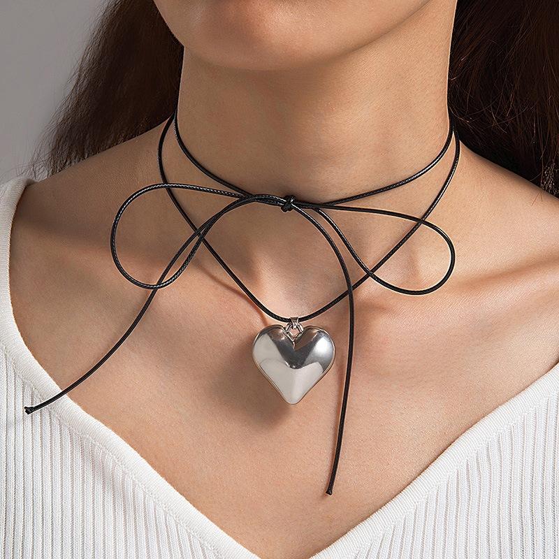 Ersya - Necklace Kalung Wanita Y2K Tali Hitam Model Ikat Pita Simple Lucu Aesthetic Aksen Liontin Love Hati Besar Gold Silver Aksesoris Fashion Korean Style Kekinian Black Rantai