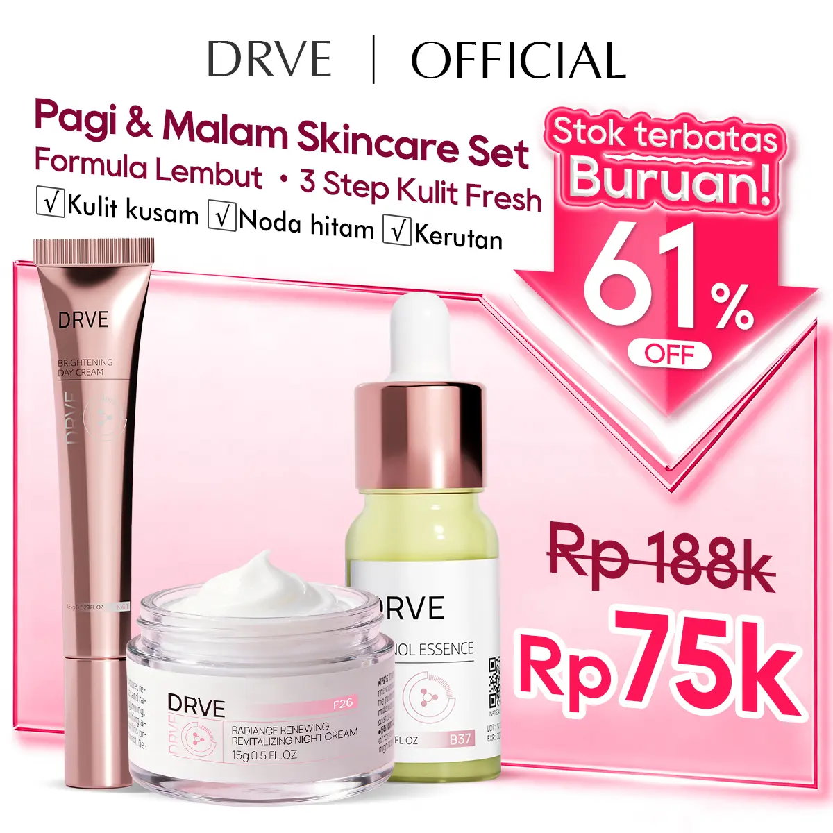 Drve Glowing Kit Bundle 3 (Retinol Essence+Brightening Day Cream+Moisturizing Night Cream) Dengan kandungan Niacinamide mampu mencerahkan wajah, menghaluskan kulit, dan menunda penuaan dini