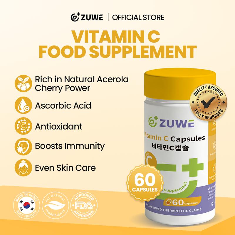 ZUWE Vitamin C Capsules (60 Caps) FDA Approved Ascorbic Acid Powerhouse! Enhance Immunity, Skin Brightening, Daily Vitamin C Supplementation Edible
