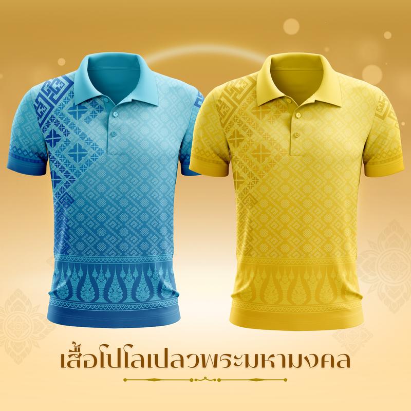 viboutiquebkk เสื้อโปโลเปลวพระมหามงคล เสื้อโปโลสีฟ้าเหลือง ลายไทย polo