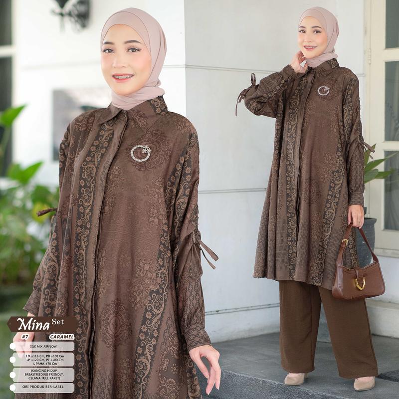 Mina Setelan Wanita Muslim Silk Mix Airflow Motif Batik Kombinasi Polos One Set Baju Celana Hijab Style