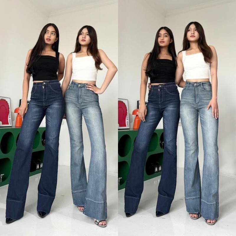 LADOUCE - Mckenzie High Waist Cutbray Jeans Celana Flare Panjang Stretch Wanita