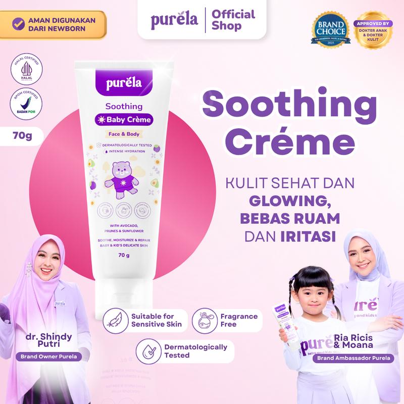 [BEST SELLER] PURELA Soothing Baby Crème (70gr) - Glowing Muka & Badan, Membantu Menghilangkan Ruam, Ruam Popok, Beruntusan, Biang Keringat, Sensitif, Beruntusan Pada Kulit Bayi - Dermatologist Tested - Cocok Untuk Kulit Sensitif Newborn dan Anak-Anak