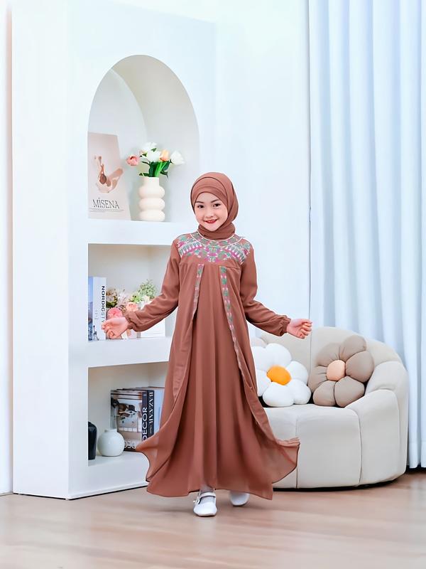 VZR Moeslim Wear Gamis Anak Ceruty Embroidery Bordir Mewah Free Hijab Muslim Baju Remaja Kekinian Crinkle Renda untuk Usia 5-9 Tahun Set Syari Lebaran Bahan Import Desain Bordir Mewah Cocok untuk Ibu dan Anak
