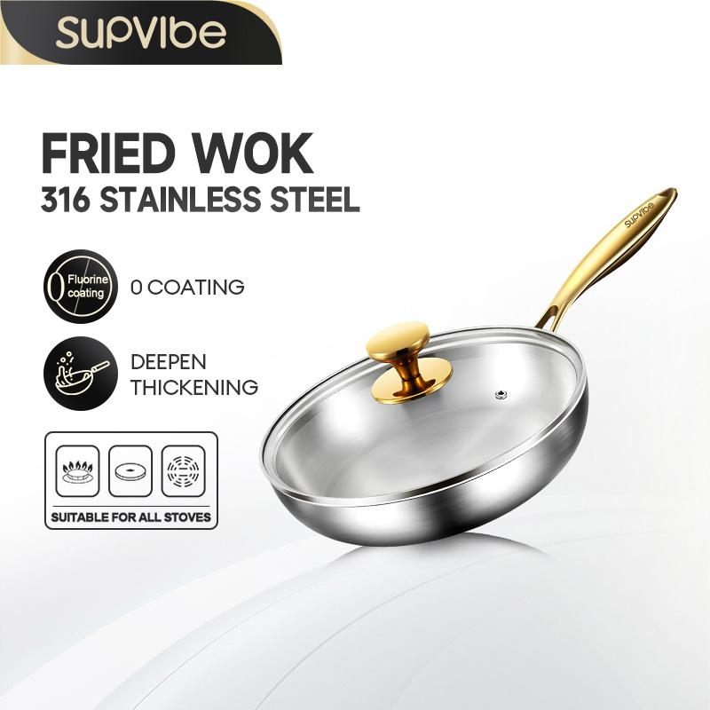 【Limited time discount】SUPVIBE 316 Stainless Steel Frying Pan With Cover Uncoated Wok Gas Induction Cooker Universal(24/26/28cm)Tahan Calar Dan Haus Cookware Pemegang Kuali Kitchenware Handle Dapur