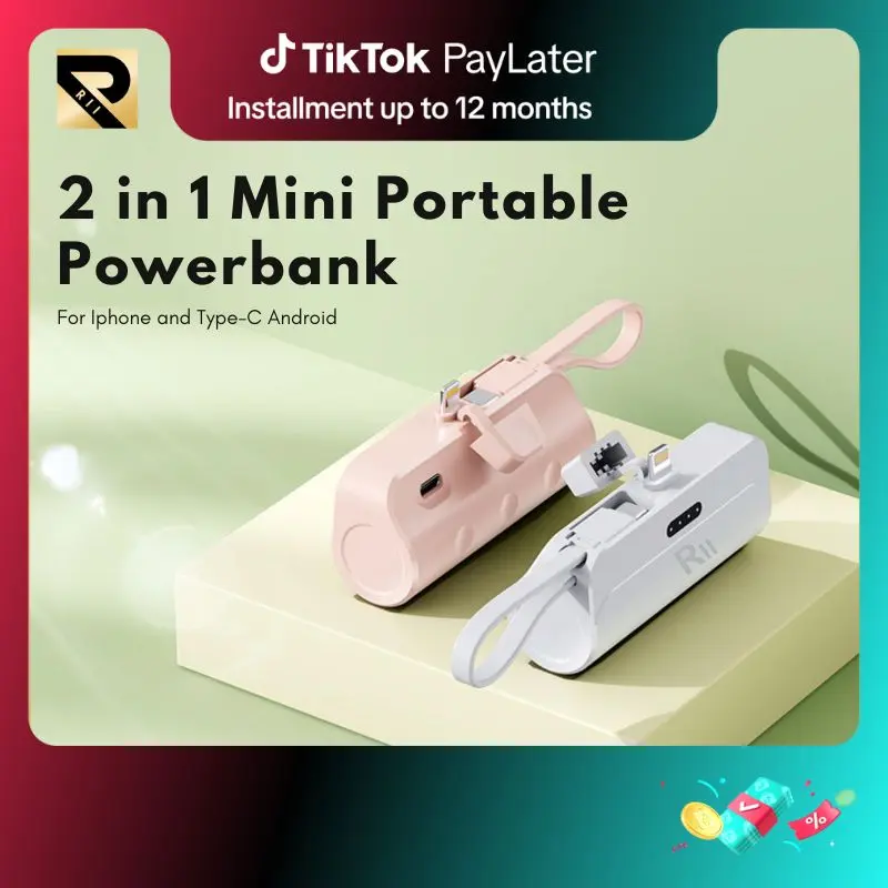 RII 2in1 5000mAh Mini Portable Power Bank w/ Built-in Cable FOR Type-C FOR iPhone Port Powerbanks Accessories Compact Charging Handy Device for school and rainy days Pink Chargeable Smartphone Plug