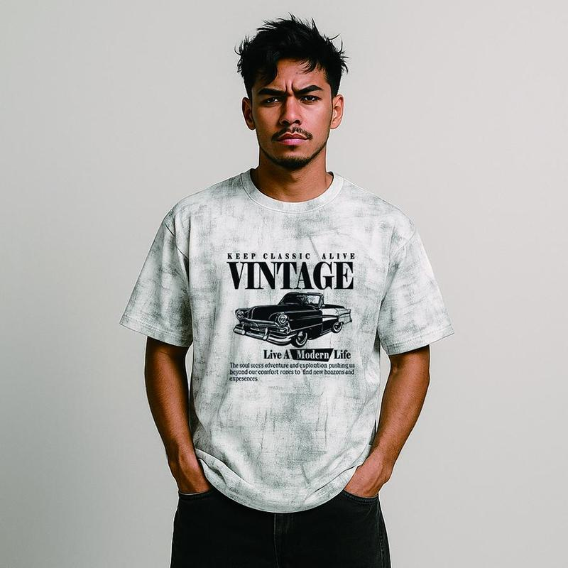 Vintage Car 250g Heavy Tie-Dye T-Shirt, gray marble wash retro graphic tee, “Keep Classic Alive” old school car design, oversized Korean streetwear fit, unisex cotton top for men women, cool casual summer OOTD pang-lakad, comfy pang-araw-araw damit