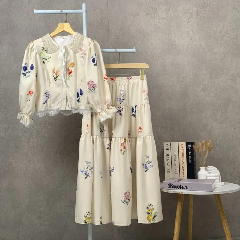 CHICMORE Blus lengan panjang bermotif bunga untuk wanita, dihiasi kerah dan hiasan renda, dipadukan dengan rok panjang